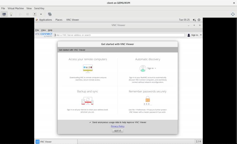 # yum -y localinstall VNC-Viewer-6.19.1115-Linux-x64.rpm